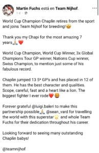 Martin Fuchs, el actual número dos del mundo, anuncia el retiro deportivo de su mejor caballo, Chaplin. El semental de 16 años se retira del deporte, pero sus genes no se perderán, ya que se utilizará en la cría.