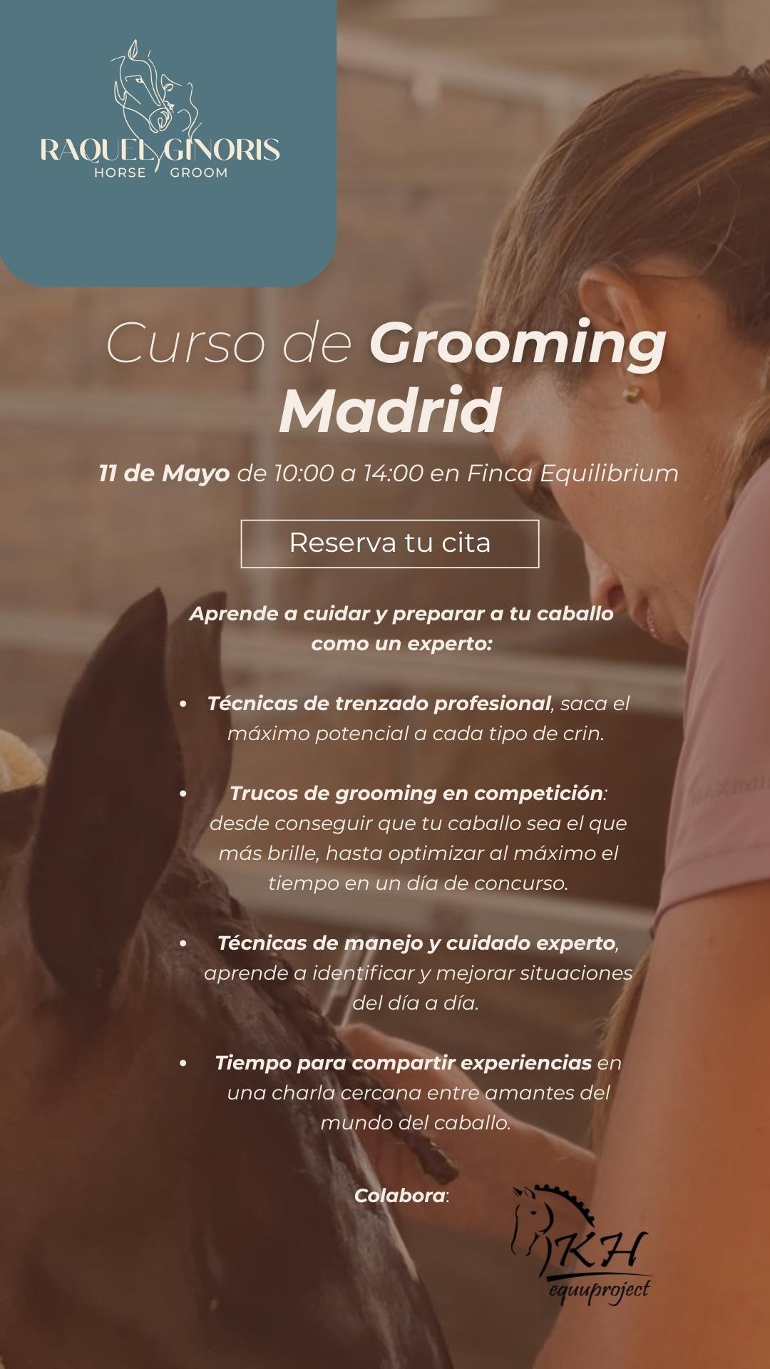 Una oportunidad única para descubrir los secretos del grooming profesional, tanto en el día a día como en el entorno de la alta competición, y sobre todo para compartir espacio y conocimientos con Raquel en un ambiente cercano, accesible y lleno de pasión por el caballo.