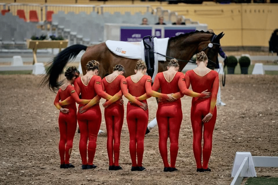 El equipo Español de Volteo está compuesto por cinco integrantes del Club hípico La Gubía de Mallorca ( Layla Anne Fraser, Hannah Bradley, Eva Noelle Garcia Müller, Amelie Tara Von Zitzewitz, Carlota Usón Jaume) y una componente del Club hípico Cortijo Guerra (Lucia Schonvant). Como reservas del equipo han ido Maria Pau Caulés de Menorca Volteig y Daniela Fernández de Club Hípico la Gubía.
