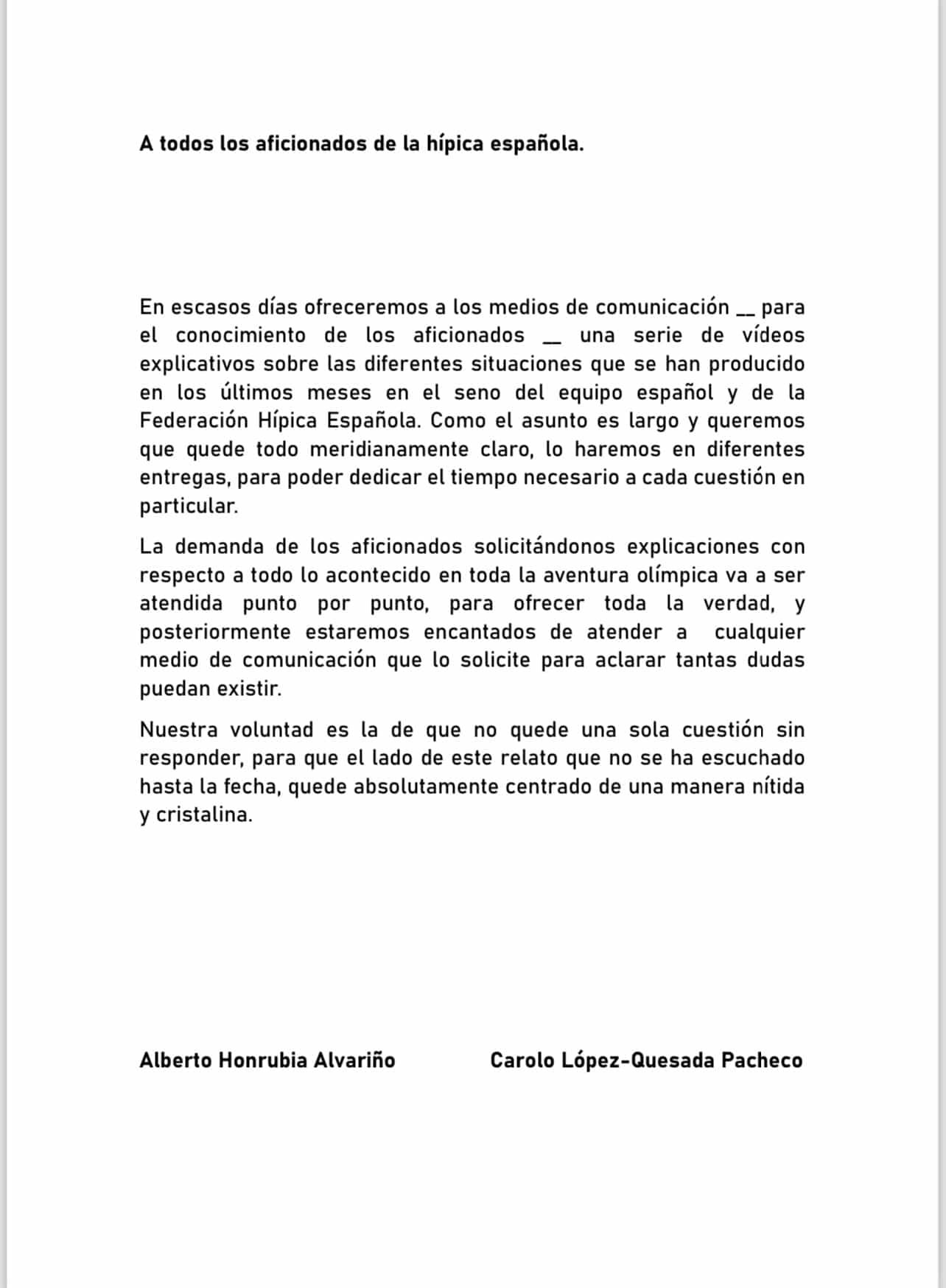 Dentro de la estrategia planteada por Alberto Honrubia y Carolo López-Quesada, ayer nos mandaron los protagonistas el comunicado acerca del plan  de comunicación que han preparado a raíz de la destitución de ambos.