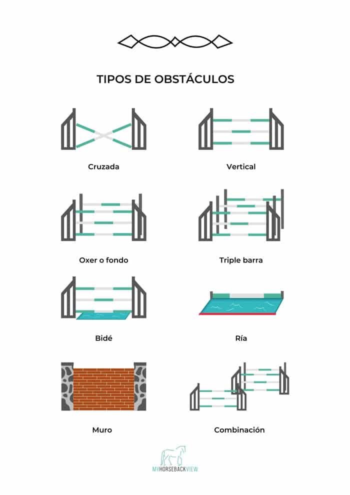 Combinación: se considera que dos o tres obstáculos son una combinación cuando están a un máximo de dos trancos de distancia. Estos se reconocen por letras (A, B y C) y, dependiendo del número de elementos que lo componen, se pueden llamar dobles (cuando son dos elementos A y B) o triples (cuando son tres elementos A, B y C). Suelen estar compuestos por verticales y fondos.