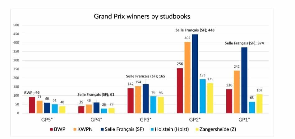 Los caballos de SF logran la mayor cantidad de victorias en Grandes Premios. El libro genealógico de Selle Français (SF) de Francia, tiene que estar satisfecho con el tercer puesto en las victorias de 5*GP. ¡Pero en todos los demás niveles, el SF proporciona la mayor cantidad de ganadores, lo supone todo un reconocimiento para los criadores!