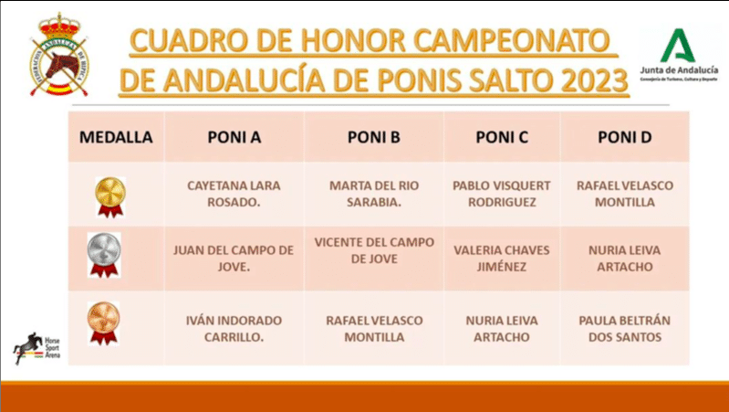 Este fin de semana ha tenido lugar el Campeonato de Andalucía de salto de ponis en Horse Sport Arena. Las pistas sevillanas vieron pasar a los mejores ponis de la comunidad andaluza, teniendo como subcampeones en la categoría de Ponis C a Valeria Chaves con su inseparable Cristal Meraniere.